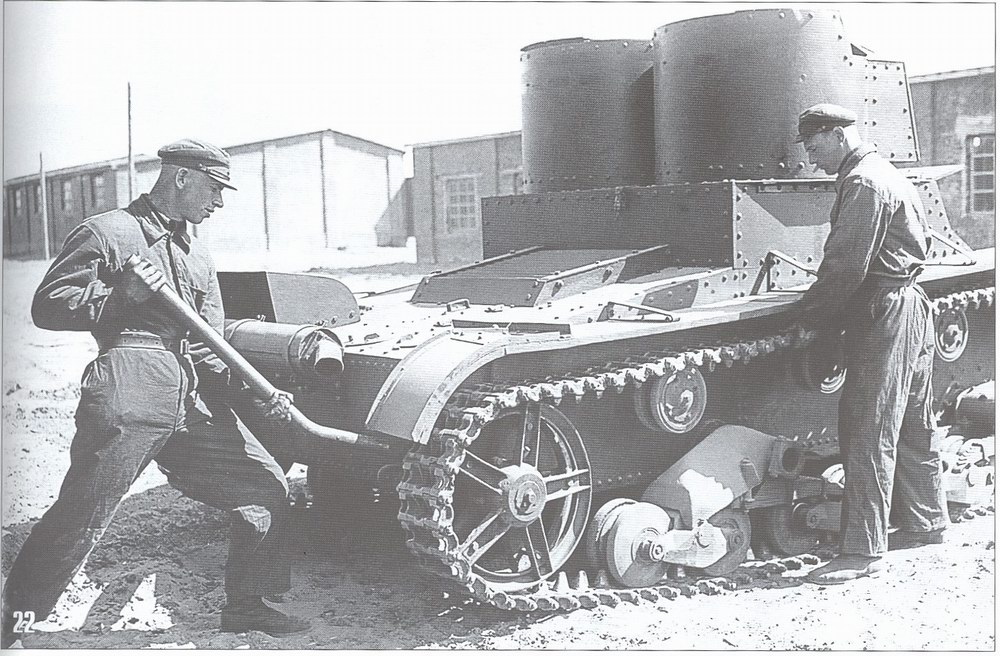 A mechanical service is being undertaken to the twin-turreted T-26 from the first half of 1932 production series (with riveted hull & turrets). Moscow Military district, summer 1934. Note that the muffler was fixed by with 2 clamps [1]