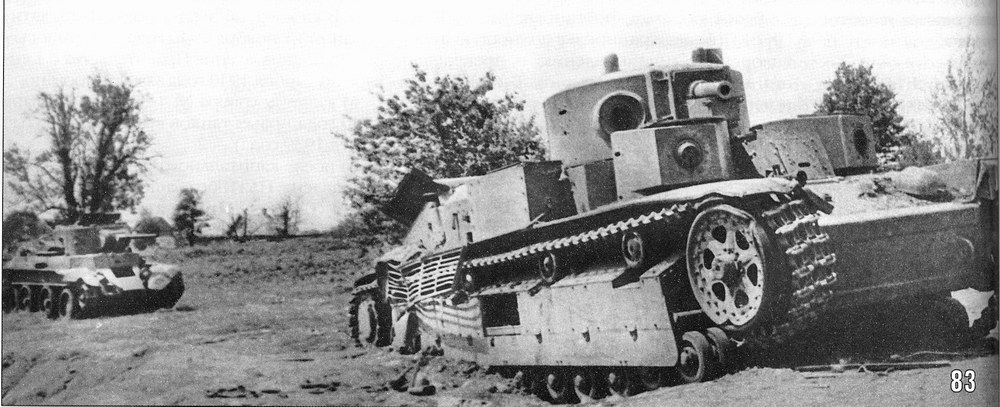 Pz. Kpfw 35(t) of the 6th Pz.Division passing by abandoned T-28 of the 2nd Tank Division/3rd Mechanised Corps. June 1941. Majority of T-28s organic to the 3rd Mechcorps were old enough and were out of order due to breakages before they had chance to fight [3] |