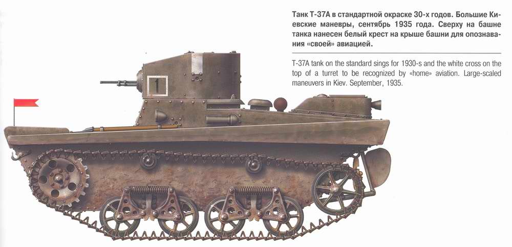 Т-37А tank on the standard sings for 1930-s and the white cross on the top of a turret to be recognized by «home» aviation. Large-scaled maneuvers in Kiev. September, 1935.[5] |
