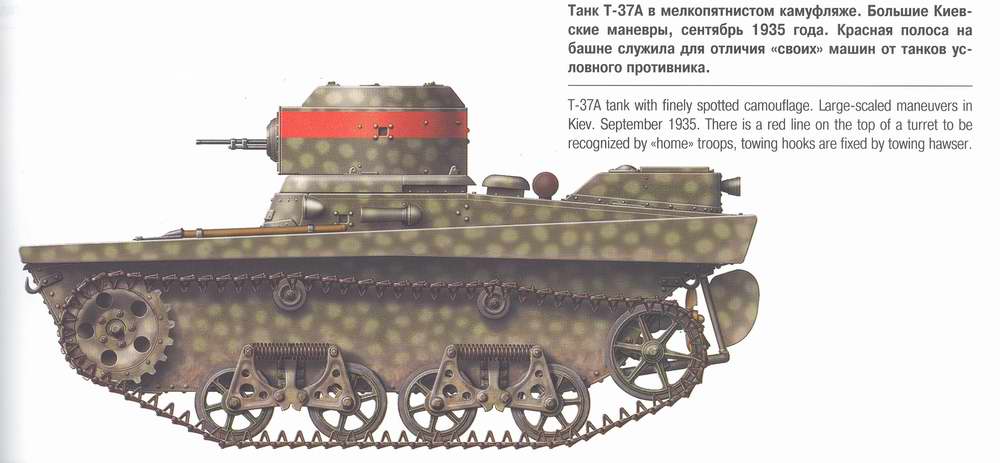 Т-37А tank with finely spotted camouflage. Large-scaled maneuvers in Kiev. September 1935. There is a red line on the top of a turret to be recognized by «home» troops, towing hooks are fixed by towing hawser.