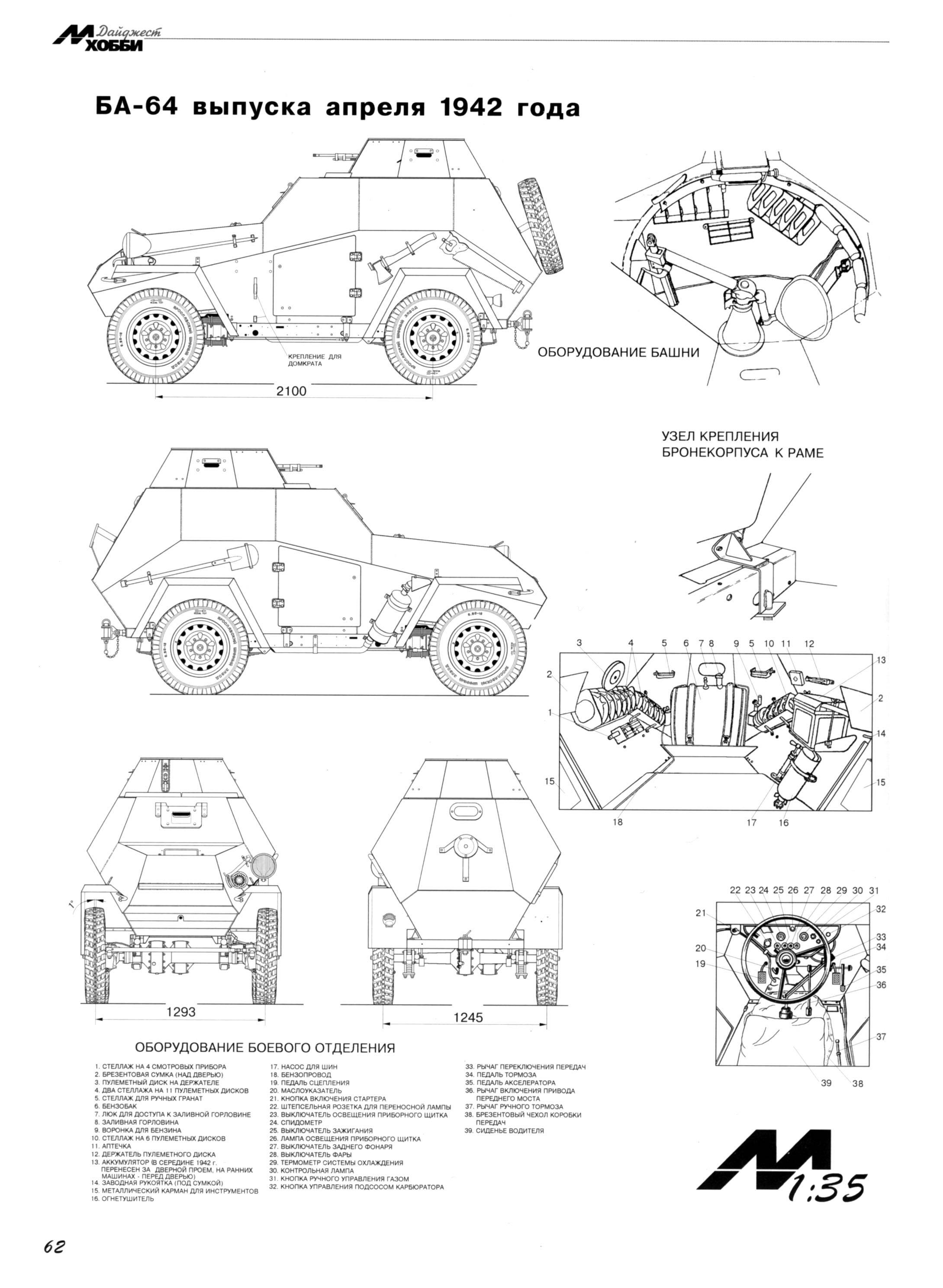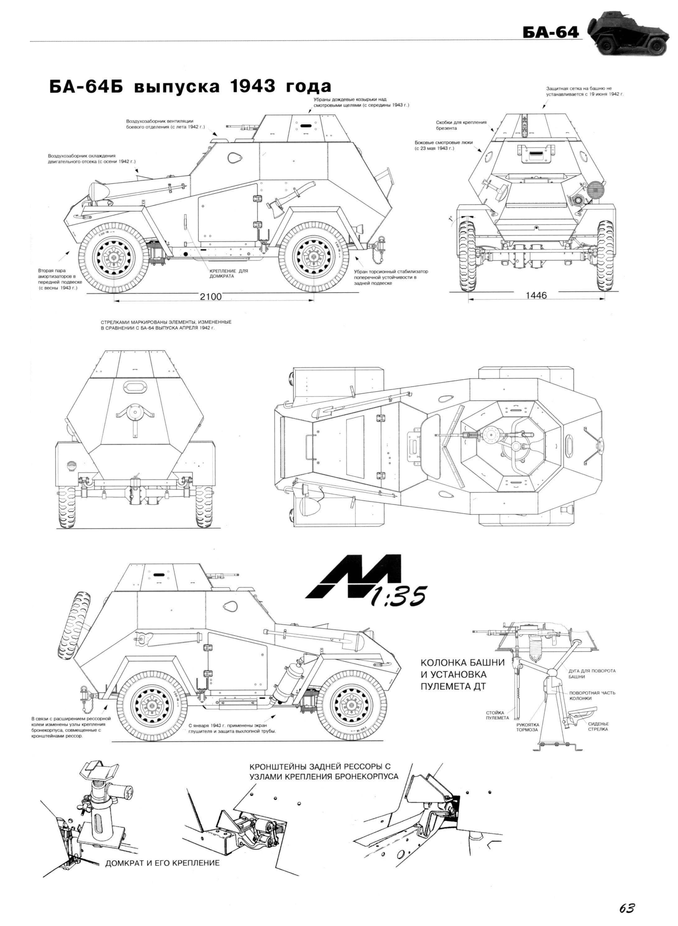 BA-64-125 differed from BA-64B with a narrower track (1278 mm front wheels, 1245mm rear wheels), changes included narrowed fenders; different placement of the trenching tool – [spade over right fender, saw with axe over the left]; absence of embrasures in control section (on some vehicles); rear springs were mounted under the axle beam (on BA-64B over it); tyre profiles were often of the GAZ-M1 type.