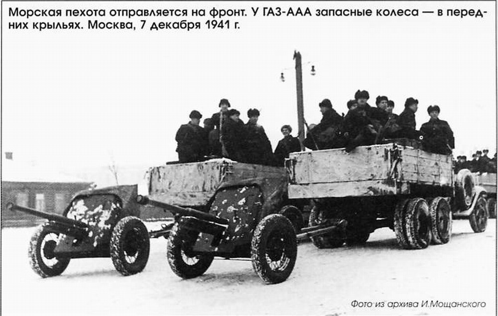 Marines on the way to frontline. GAZ-AAA carries spare wheels on its front fenders. [1] |
