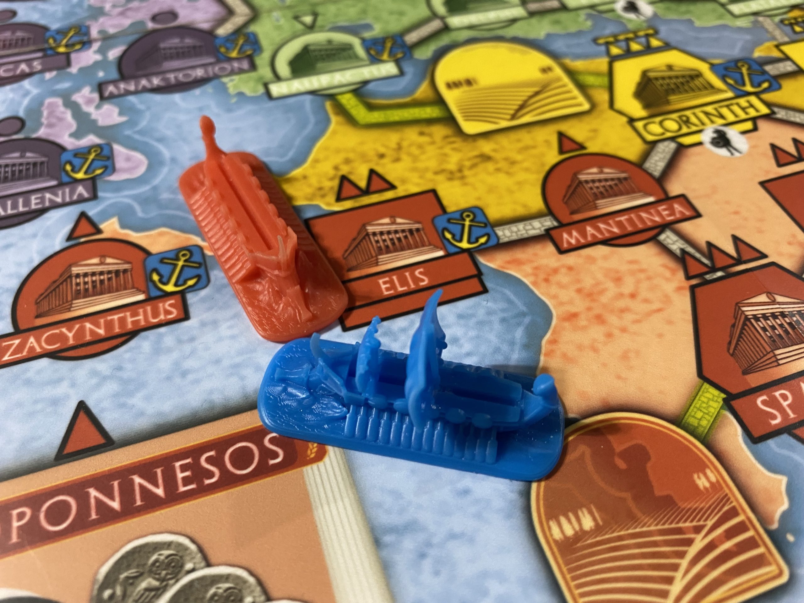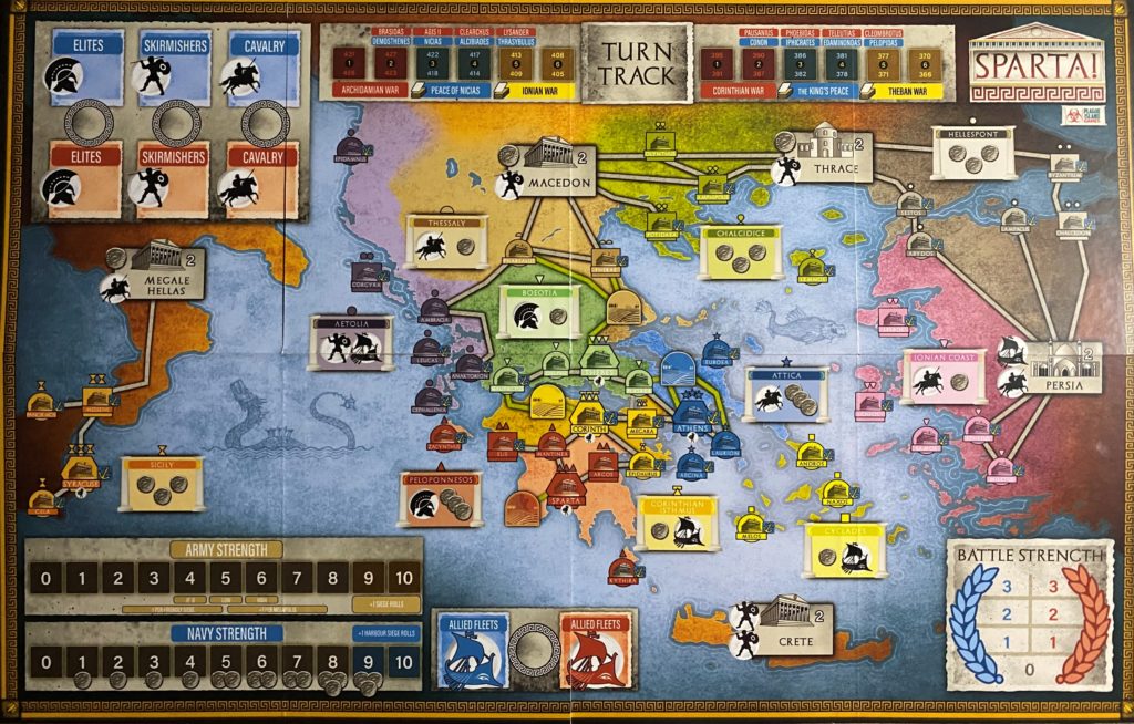 In Sparta!, you get two great wars in one game as the included scenarios cover the Peloponnesian War or the later Theban war. While Sparta stays basically Sparta, the game differentiates the abilities of Athens and the Thebes.