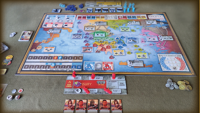 Plague Island Games provided us with a demo/prototype copy of the game. While it’s not quite the finished production version, it’s really close to it. By way of comparison, Plague Island did the same thing with their first game 2 Minutes to Midnight, and the differences between that prototype and the final game were very minimal, so I expect the finished version of Sparta to be very similar to this prototype.