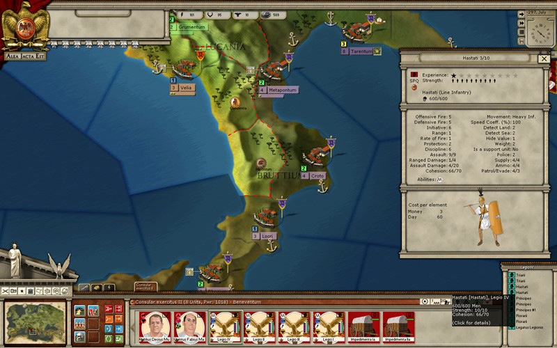 Terrain graphics, interface and game mechanics are the same in Birth of Rome as in the earlier game (Click to see Jim Cobb’s review of Alea Jacta Est on ArmchairGeneral.com). Suffice it to say, these features are attractive, accessible and historically accurate. Game mechanics are so similar between the two games that the manuals and tutorial scenarios are the same. The challenge graphically is to represent the varying equipment and armor of so many types of troops. Not even the Romans had standardized apparel within the main lines of the maniple, with hastati, principes and triarii appearing very different from each other. Throw in the Samnites and four other Italian peoples, the Celts, the Greeks and Carthage’s polyglot of mercenaries and one could almost accept a standardized “the other guys” troop graphic. The crew at AGEOD did not take the easy way out; instead, they provided a detailed, accurate picture and game values for all troop types. The only “fudge” is giving all Roman legions an eagle standard when the eagle only became universal with the Marian reforms of 106 BC.