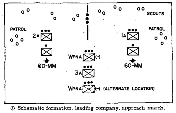 “12. Approach March By Day. –a. In daylight the approach march must be made in formations which provide protection against artillery fire, attack by ground forces, and air attack; which permit maximum utilization of the terrain for concealment and cover and for protection against attack by armored forces; and which enable the company commander to maintain control of his company. Consequently, platoons will be separated laterally, or in depth, or both.” (FM 7-10 page 15)