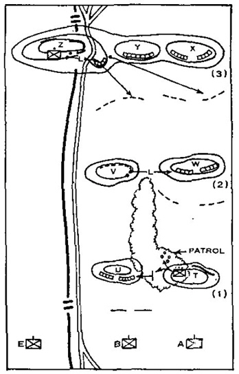 “(2) Co B, taking advantage of the woods on its right, captures Hill V. Co A is held up in front of Hill W. Co B employs its light machine guns to assist Co A and thereby assist its own advance by removing a possible threat to its own right flank.