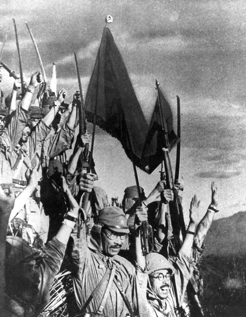 Japanese troops cheer their victory over the American-Filipino defenders of Bataan. (National Archives)
