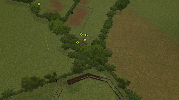 My initial orders are to advance behind the tree line so as to remain out of sight until we’re ready to open fire. As my two MG squads approach the tree line I order them to crawl forward and deploy their guns at the edge. My infantry squads will continue to advance cautiously.