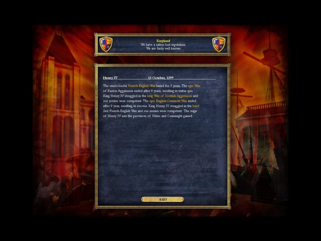 Nations also have goals and fears. So the French player might be flattered to find that Burgundy fears the might of France and is desperate to marry one of their daughters into the French royal family. The player’s nation will also have national goals, like the unification of Ireland under the English Crown. These goals are based on history, and tend to keep the flow of the game away from Risk-like free-for-alls. But despite national goals, EUIII is still an amazingly open-ended game, and the player has a great deal of freedom in choosing a path.