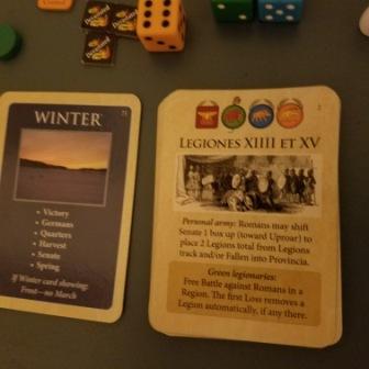 During the Winter card phase, victory points are totaled up to see if any of the factions has met its victory conditions to win the game; then the German tribes get to take their actions; then the factions have to follow rules for Quartering their units against the inclement weather; then the factions Harvest their crops and check their supply lines; then the Roman senate meets and their impression of how Caesar is performing his duties can lead them to either withhold their support or, just maybe if Caesar has impressed him, authorize more legions to join his campaign in Gaul. Finally the Spring phase resets markers and gets the players set up for the next sequence of events.