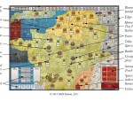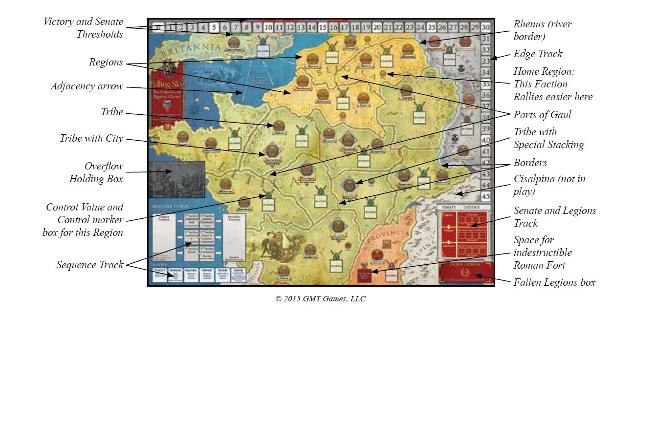 The map board itself is a work of art. Each region of Gaul is marked for cities, tribes, control value of the area plus tracking charts for victory points, Roman senatorial status, fallen Roman Legions and turn sequences line the edge of the board.