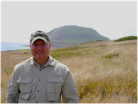 Colonel John Antal, US Army (Retired), on Iwo Jima overlooking the 1945 invasion beach with Mount Suribachi in the background.