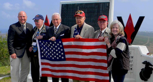 Mount Suribachi, March 13, 2013. From left to right: Colonel John Antal, US Army (Retired); Mr. Fiske Hanley, US Army Air Corps and a B-29 Flight Navigator in WWII; Lieutenant General Lawrence Snowden, USMC (Ret.) a WWII Iwo Jima veteran; Bill Schott, a WWII USMC Iwo Jima veteran; Don Graves, a WWII USMC Iwo Jima veteran; and Laura Leppert, daughter of a Marine who fought in the 5th Marine, 26th Regiment, 1st Battalion on Iwo Jima. Colonel John Antal helped fund and escort the three Iwo Jima veterans: Mr. Hanley, Schott and Graves from Dallas, Texas to Iwo Jima.