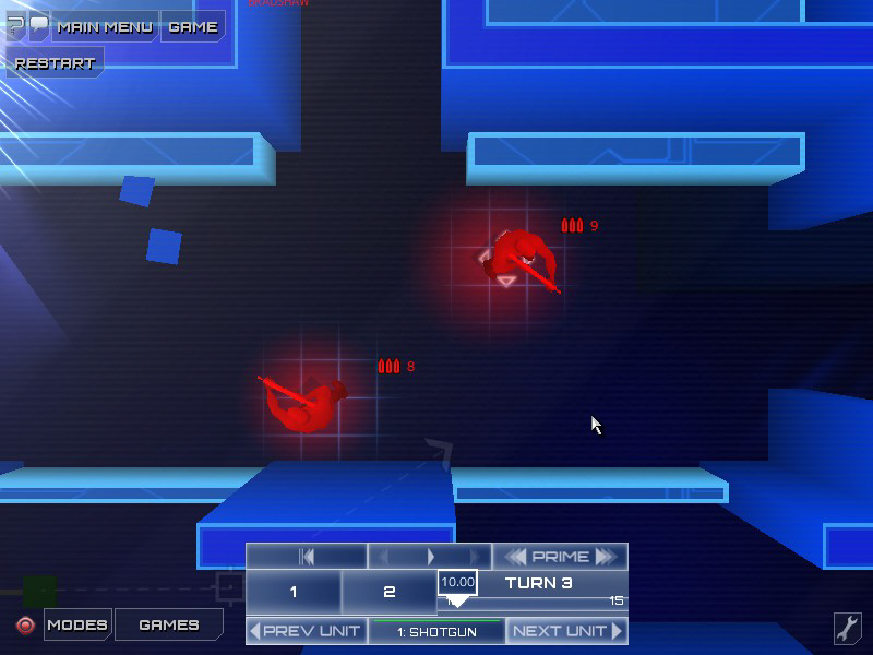 Despite the limited options, the randomly generated terrain creates a maze of rooms, corridors, and deadly crossfire zones that make each game fresh. Terrain consists of two aspects—walls and half-walls. Walls are used for cover and to comprise the various rooms and half-walls serve as windows or tables that can be used as good vantage points but offer minimal protection to someone standing. Height is set on one level, but half-walls may be used as partial cover to duck behind, so the fighting takes place in one-dimensional rectangular and square rooms. The walls and half-walls can be destroyed, not by regular gunfire, but by explosions from grenades and missiles. Worms this is not, but Frozen Synapse is going for a totally different vibe. Battles epitomize the saying that life is brutish and short. Matches typically last around five to ten turns. There are no drawn out firefights – the player either gets seen and taken out or uses superior strategy and some luck to get the bead on the enemy.