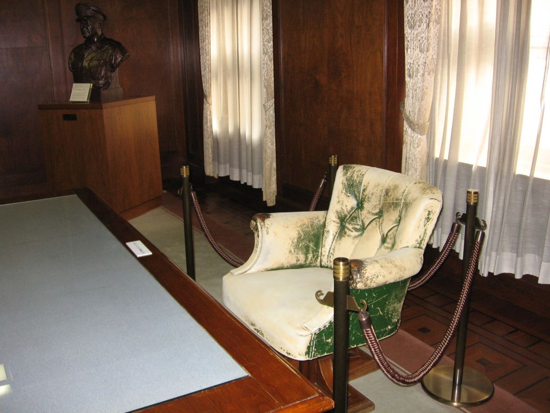 The desk on the photograph looks quite empty. I remember some of those famous “corn pipes” of MacArthur on the desk and a visitors book, with only 5 pages of names of visitors. Regards, Lodewijk.