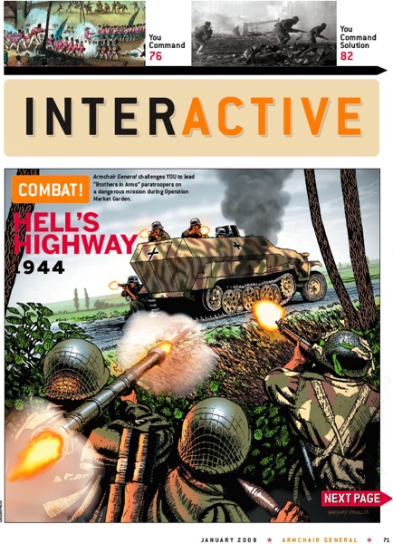 How would you fare in carrying out this bold plan? Find out with PC games like Highway to the Reich (Panther Games) or Brothers in Arms: Hell’s Highway (Ubisoft). An Operation Market-Garden download is available for Call of Duty 4 (Activision). Boardgames include The Devil’s Cauldron (MMP) and Arnhem — Defiant Stand (Critical Hit). Many other games have explored this operation, including Operation Market-Garden, a double-blind boardgame from GDW; and the boardgames Hell’s Highway (Victory Games) and Storm Over Arnhem (The Avalon Hill Game Co.) All three are, unfortunately out of print (OoP). ONLINE SPECIAL: Read John Antal’s narrative based on the Market-Garden scenario in this issue of ACG, adapted from his novel Band of Brothers: Hell’s Highway, a companion book to the Activision computer game.