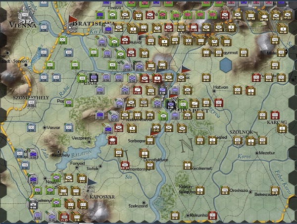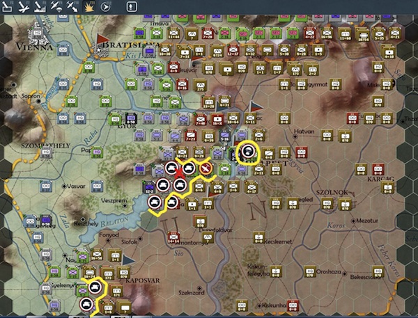 The real effort of my current turn was to reinforce the Bratislava approach (the northernmost yellow circles, and to place some powerful reserve forces, indicated by the red circles, east of Gyor, west of Kaposvar, and at the eastern edge of Lake Balaton.
