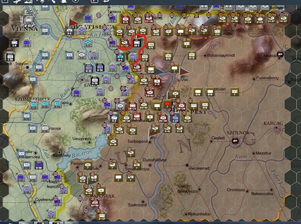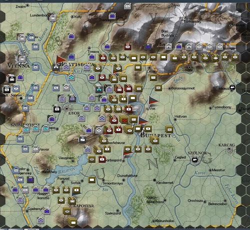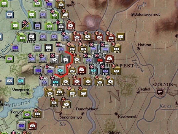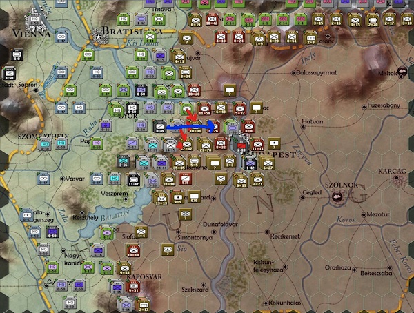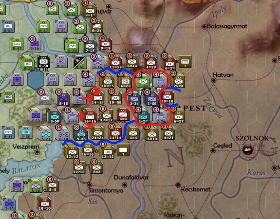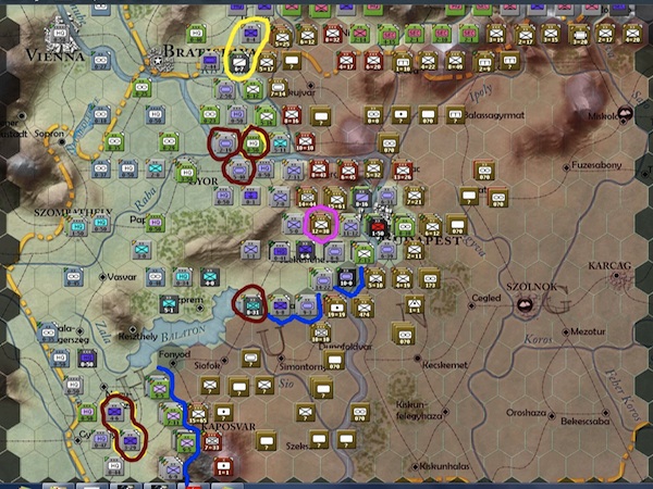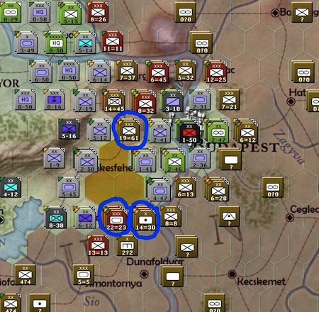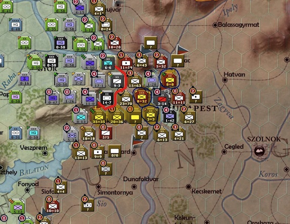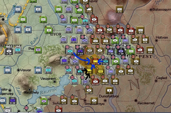 Three more hexes guarding the city of Budapest have fallen (blue circles). The soviets just have too many men guarding the approach to Budapest now. They will most likely breakthrough to the city on their next turn.