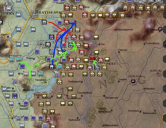 After due consideration, I believe my two best bets are Ersekujvar in the north and Esztergom near Budapest. I now have to try and marshall my forces and launch the attacks. To the north I will move the units westward to plug the gaps where the Hungarian forces surrendered. The assault on Ersekujvar will be launched through the 23rd Tank Corps with 4-6 infantry divisions (red arrows below), depending on how many I can maneuver with sufficient movement points to launch a deliberate attack. In addition, I will use a couple of Panzer divisions (blue arrows) to launch the final assault on Ersekujvar. If I have sufficient units after executing those attacks, I will launch the assault of Esztergom (light green arrows). I do not believe that this objective is achievable, but I need to try to gather some victory points.