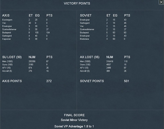 The Soviets did manage to dislodge the SS Hitlerjugend SS Panzer Division so I did not hold any of the German objectives at the end of the game. While I understand that the attack did cause Tim a moment of consternation, he was able to roll the 18th and 23rd Tank Corps as well as the 1st Guards Mechanized Corps back into Ersekujvar. Here is the final map and the final score: