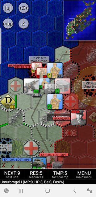 Each unit is rated for damage points, movement points and fatigue. In addition, each unit has a tactics menu which allows the player to customize the units attack strategies and defensive strategies. For example, a unit can be ordered to maintain a breakthrough attack strategy which makes it very aggressive at the risk of losing damage points by being overly concerned with taking ground over defense. For defensive strategies, a unit can be ordered to offer a stiff, normal or flexible defensive posture.