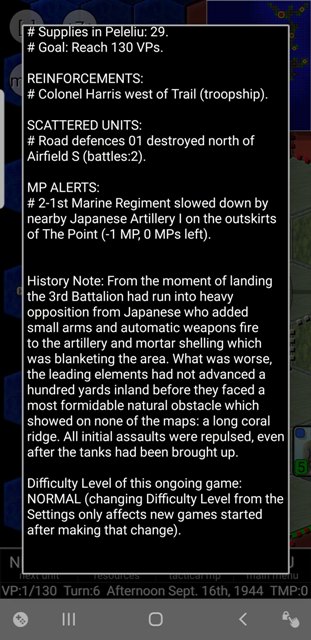 Peleliu 1944 is a strategic look at this most horrible of World War 2 Pacific battles. Each turn is approximately 3 hours long and each unit is a regiment. At the bottom of the screen is a status line showing the turn number and month, day and year. Also on the status line are indicators for the victory points earned, temporary movement points and rail movement points.