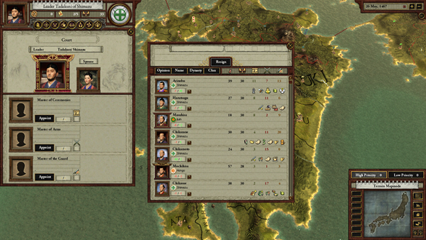 This hornet’s nest of threats can be tackled first at home. Vassals can be appointed to three positions: Master of Arms, of Ceremony, and of the Guard. Given that the appointees have high enough scores for seven skill levels in various traits, these courtiers can improve buildings, raise taxes, carry out intrigue and diplomacy while waging war. Promoting guilds opens the short tech tree. Appointments cost honor points but losses are more than recouped through a better exchequer, happier peasants, and diplomatic coups. Further honor comes from marrying well, having sons, winning battles, and giving money to the emperor.