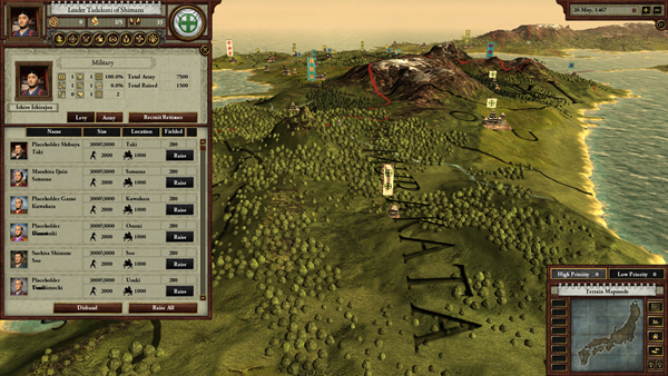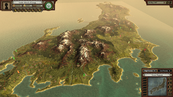 One is struck by the Sengoku’s graphics. The 3D terrain map of the Japanese islands is the most impressive map from Paradox yet. Zoomed out, the snow-capped mountains are visible; zoomed-in, rivers run past small villages. The other seven maps detail provinces, ownership of desmans, diplomatic relations, religions, and other clan leaders. Zoomed-in armies fight animated battles with soldiers in lacquered armor hacking at each other. Golden tracks show the movements of forces. Drop-down menus are very attractive with fine portraits of vassals, spouses, and heirs. Province menus have illustrated clan insignia guilds and buildings. Clear mouse tooltips help ease the learning curve. Music is not intrusive.