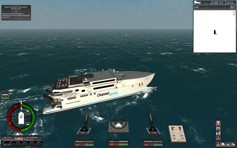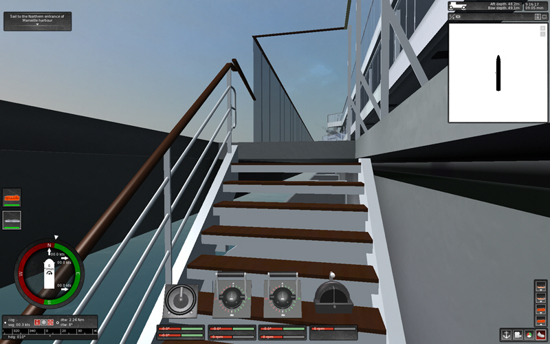 Each ship has a different set of controls for steering and speed. Steering is usually done by a wheel that can either be dragged with a mouse or be adjusted with keyboard commands. Throttles work the same way but many larger vessels have multiple throttles. Each can be adjusted individually to complement steering, e.g. reversing the port throttle while goosing the starboard makes a sharp left turn. This example shows the intricacies of the physics model where inertia, size, speed, and environment are depicted in great accuracy. Larger ships have bow thrusters to aid in close quarter maneuvering. Direction and speed can be locked but caution must be used as wind and tide work on the vessel. The effect of these elements is shown on an abstract diagram inside the on-screen compass. The compass not only shows the heading but also can reveal the relative position of a goal’s spot during a mission. A chart showing the craft’s position can be enlarged, zoomed, or even hidden. When a small craft is launched, its icon appears above the primary vessel; clicking on it moves the player to it.