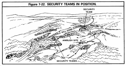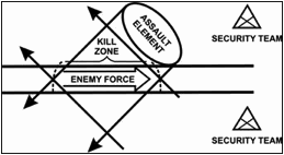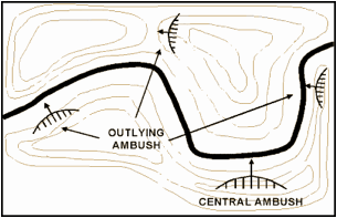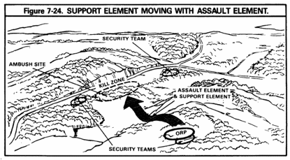 Ambush Forces – The graphic highlights the locations for the assault, security, and support elements. Please refer to our terminology discussion earlier to review the roles of these elements.