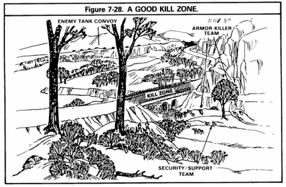 Kill Zone – Within the ambush site, this is the location where you will fire your weapons in order to achieve your purpose.  In selecting a kill zone, you want terrain in which obviously the enemy is going to enter; it has terrain which can channelize the enemy; and is large enough so that the ambush force can destroy numerous enemy vehicles.