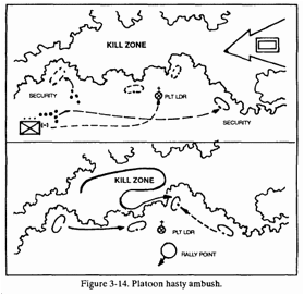 Rally Point – Behind the assault/support forces is the rally point. This should be a easily identified piece of terrain where forces can link-up before departing the overall ambush site. If the ambush is conducted in limited visibility; you may have forces placed at the rally point to aid in link-up.