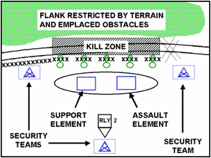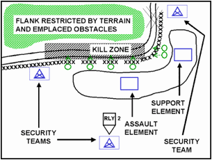 Protective Obstacles – These are emplaced between the kill zone and the assault force. These obstacles provide security for the assault force. They also assist in providing the assault force time when they displace. These obstacles can range from wire (shown on the graphic) to minefields. As always, once obstacles are emplaced you ensure friendly forces know where they are so they do not run into them. There are few things worse than having to breach friendly obstacles. The one thing that is worse is suffering casualties to a friendly obstacle.