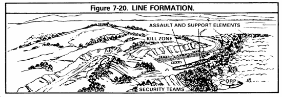 Linear (or Line) – A linear ambush places both its’ assault and support elements on line, parallel to the kill zone.  This usually provides a fairly lengthy kill zone with fires being directed at the flanks of the enemy. Obviously, you want to get as much of the enemy as possible in the kill zone prior to firing the first round. Fire too early or too late and the availability of targets are diminished. Additionally, a well-disciplined enemy will utilize dispersion in his maneuver. Dispersed vehicles again, limit the availability of targets in the linear ambush.  A linear ambush is usually easier to execute and command and control than other formations.
