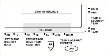 Long Leg – The assault element is positioned to inflict as much destruction as possible in the kill zone. To assist them, a security team has been positioned on the flank. Additionally, their medical and demo assets and forces to aid with enemy prisoners of war.