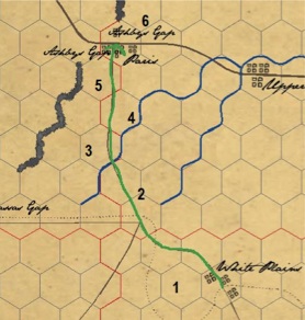 In the map above, imagine that you are moving a unit from White Plains northward to Ashby’s Gap. The red lines indicate the borders of the tactical map tiles. The unit’s route of march is traced in green. Note how the road transits three different border tiles. As your unit crosses each border the screen refreshes to display only the tile the unit is in. In this case, this means six separate refreshes as your unit crosses from one tile to another. This isn’t too much of an issue if you have enough MP to make the entire journey and/or have a thorough knowledge of the geography. Often, though, you’ll find yourself on a hex (# 4, for example, below) with a section of road disappearing to the North and South. You’ll have to take time to jump between the map tiles and regain your bearings. Frankly, it’s tedious.