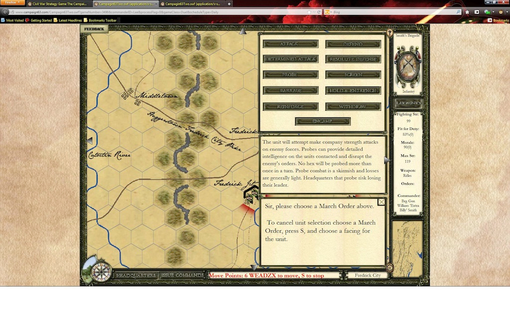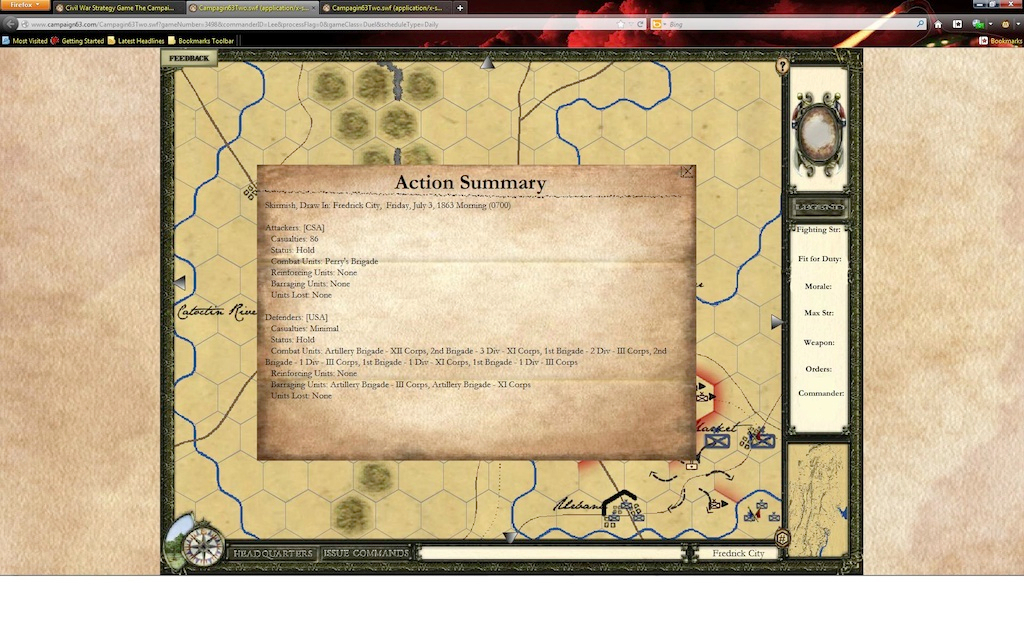 The map system also creates blind spots around the big objective cities that, combined with the undocumented and vague ZoC rules, movement timing, and initiative rules, appears to be readily exploited by experienced Campaign 63 players. Indeed, a look at the leaderboard shows the top five–rated commanders have won a combined 78 percent (402 wins – 90 losses) of their games. Several players have voiced complaints on the Campaign 63 forums about map exploitation, especially by Confederate cavalry that dashes between Federal ZoCs to capture city hexes. These complaints have been greeted by experienced players with variations of “guard your cities betterâ€â€”a valid, though snarky, answer and hard to justify when ZoC and movement rules are not documented for newcomers. Casual players are liable to get the unfortunate impression that old-timers are taking an unfair advantage of noobs in order to pad their victory totals. The leaderboard does not break down wins by Union/Confederate so I can’t say for certain if the majority of those 402 wins were Confederate victories, but based on the forum complaints, I would not be surprised if they were.