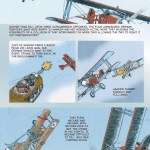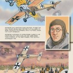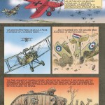 In a chapter following the account of the Red Baron’s death, Vansandt tells the story of the last days of the Flying Circus. The book concludes with short bios of other famous pilots, illustrations and stats on the planes of Germany, Britain and France, and a list of recommended books. There is also a very nicely done two-page illustration of a red Fokker triplane flying above breaks in the clouds.