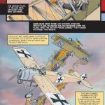 Rather than starting with Richthofen switching from the cavalry to the air service or with his first aerial combat, the story begins with a detailed account of what was the German pilot’s 11th victory. It consists of seven pages, mostly depicting the aerial duel between Richthofen in his Albatross and British major Lanoe G. Hawker flying a De Havilland D.H. 2. This action sequence effectively draws the reader into the book, following the turns and dives of two skilled pilots (Hawker, Vansant notes, had already won the Victoria Cross.), until Hawker takes a bullet in the back of the head, killing him and sending his plane to crash a few hundred yards from British lines. Following this “ripping good yarn” introduction, the story flashes back to provide details of Richthofen’s military lineage and his early years from childhood through his service with the 1st West Prussia Cavalry Regiment in the Great War.