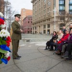 - Brigadier General Raymond R. Descheneaux, Assistant Deputy Commandant for Aviation, and R. Bryan Allison, Spirit of ’45 representative, place the memorial wreath. Photo by Jeff Malet.