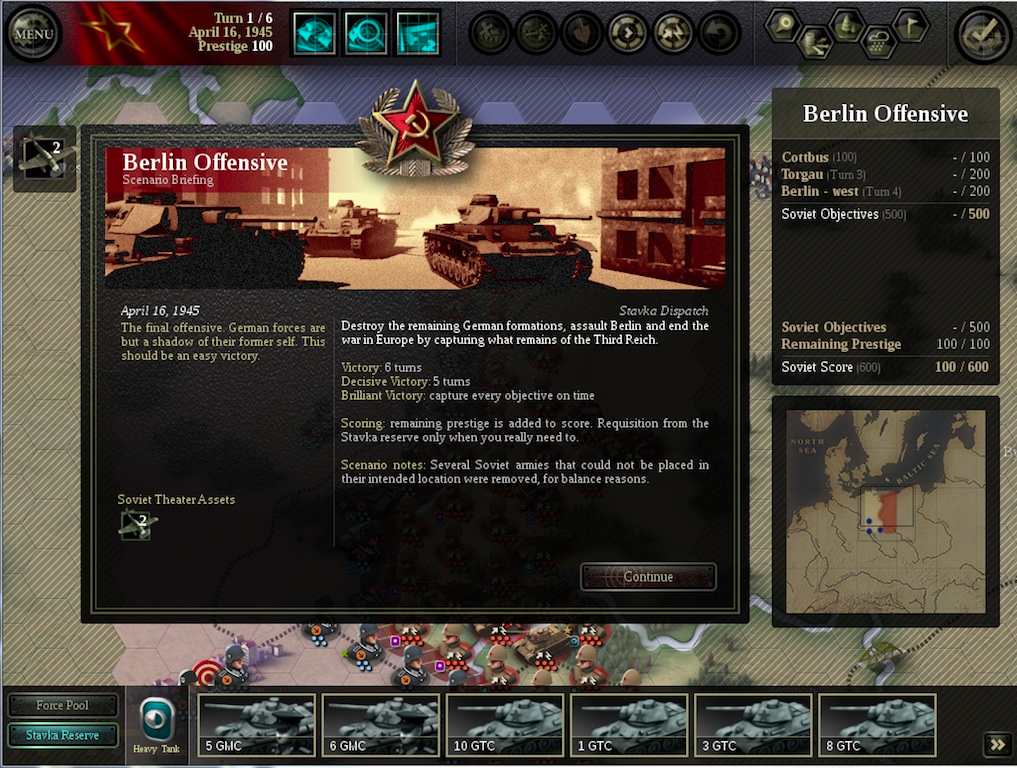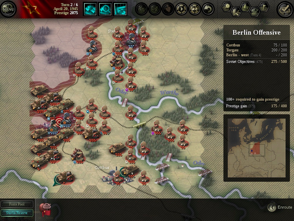 Not everything is Edelweiss flowers and Red Stars, though; the DLC has some missed opportunities and there are some minor turnoffs to be found. The PvP mode lacks the “undo move” button so important for single-player games. The original game’s strength was found in bold, sweeping maneuvers; some scenarios in the latest version are more constrained, forcing the player to spend more time worrying about swapping unit positions and wrestling with the engine than planning larger maneuvers. Thankfully, these scenarios are in the minority. The AI also has a tendency to defend cities with elite SS Panzer divisions—which is frustratingly effective but ahistorical and can break up the flow of some scenarios while the player tries to flush Wiking out of the rubble. The developers are aware of the problem and are addressing it. During the beta test and after launch, 2×2 has been eager for player feedback and have been quick to address any problems raised.